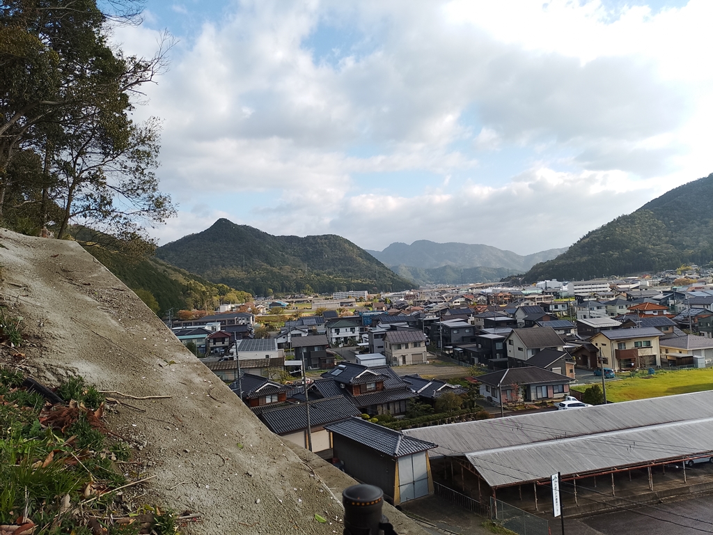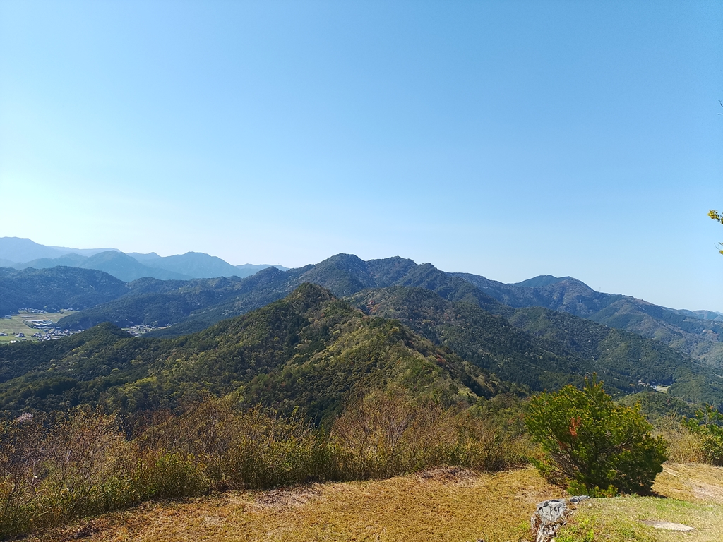 佐治方面、明日歩く予定のカヤマチ山~岩屋山の尾根と電波塔が見えます