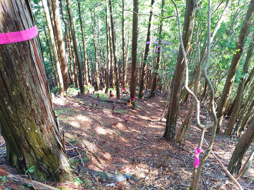 尾根沿いに鹿柵の支柱が倒れていてワイヤーに足を引っ掛けてしまいそうなので注意です。